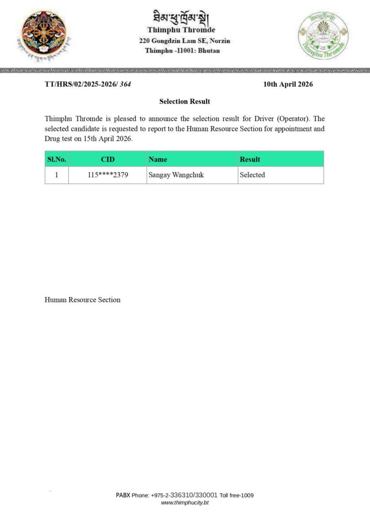 Thimphu Thromde is pleased to announce the selection result for Driver (Operator). The selected candidate is requested to report to the Human Resource Section for appointment and Drug test on 15th April 2026.