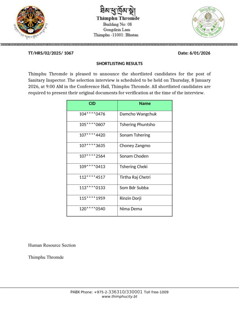 The selection interview is scheduled to be held on Thursday, 8 January 2026, at 9:00 AM in the Conference Hall, Thimphu Thromde. All shortlisted candidates are required to present their original documents for verification at the time of the interview.
