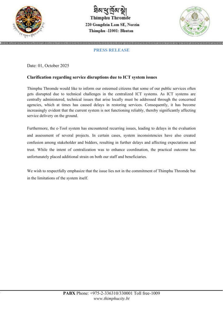 Press Release!By Pema TShomo / October 1, 2025 𝘊𝘭𝘢𝘳𝘪𝘧𝘪𝘤𝘢𝘵𝘪𝘰𝘯 𝘳𝘦𝘨𝘢𝘳𝘥𝘪𝘯𝘨 𝘴𝘦𝘳𝘷𝘪𝘤𝘦 𝘥𝘪𝘴𝘳𝘶𝘱𝘵𝘪𝘰𝘯𝘴 𝘥𝘶𝘦 𝘵𝘰 𝘐𝘊𝘛 𝘴𝘺𝘴𝘵𝘦𝘮 𝘪𝘴𝘴𝘶𝘦𝘴