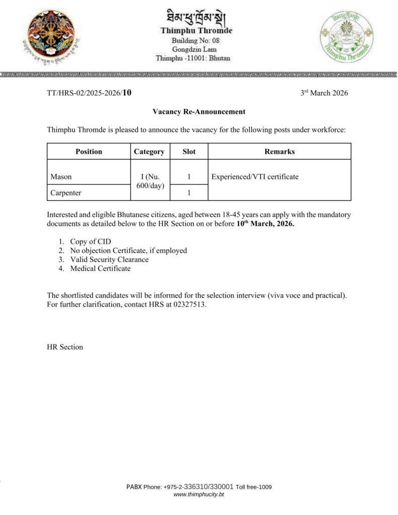 himphu Thromde is pleased to re-announce the vacancy for the following posts under workforce. Interested and eligible Bhutanese citizens, aged between 18-45 years can apply with the mandatory documents as detailed below to the HR Section on or before 10th March, 2026.